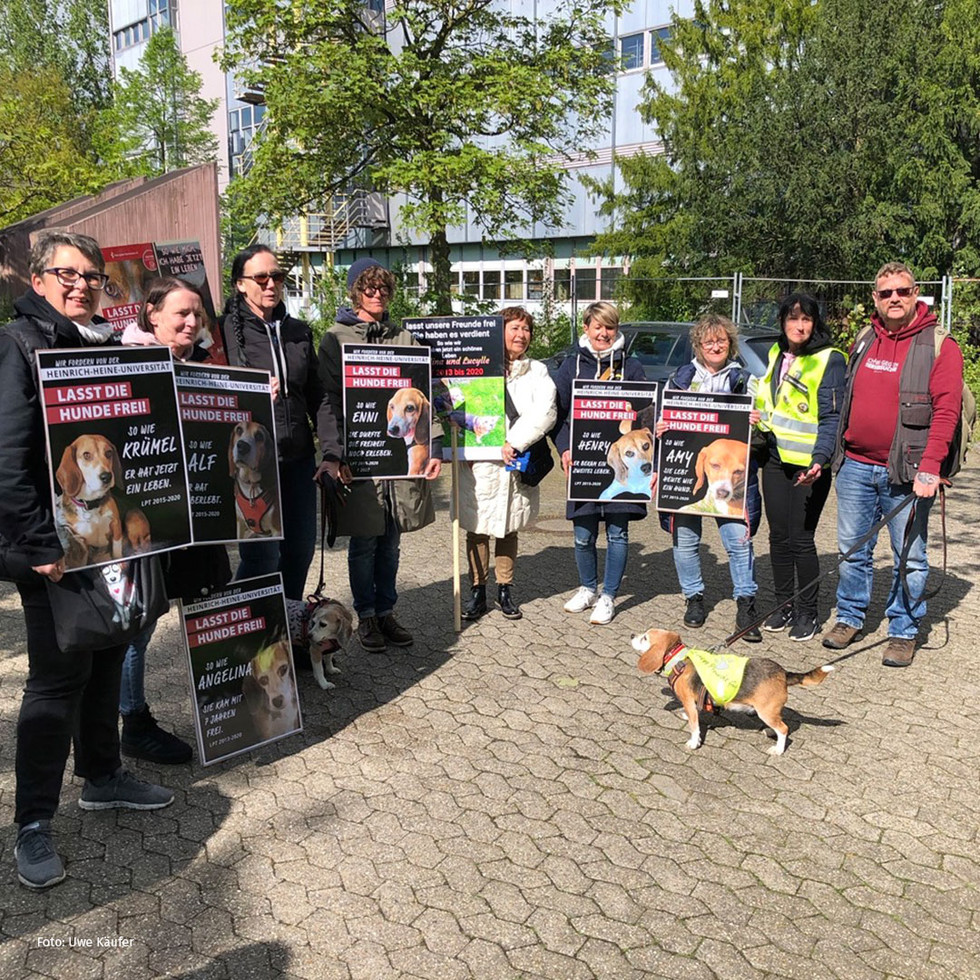 Am 21. April 2024 demonstrierten 150 Menschen vor dem Tierversuchslabor der Heinrich-Heine-Universität für die Abschaffung von Tierversuchen und um die Freilassung von Laborhunden zu erwirken.